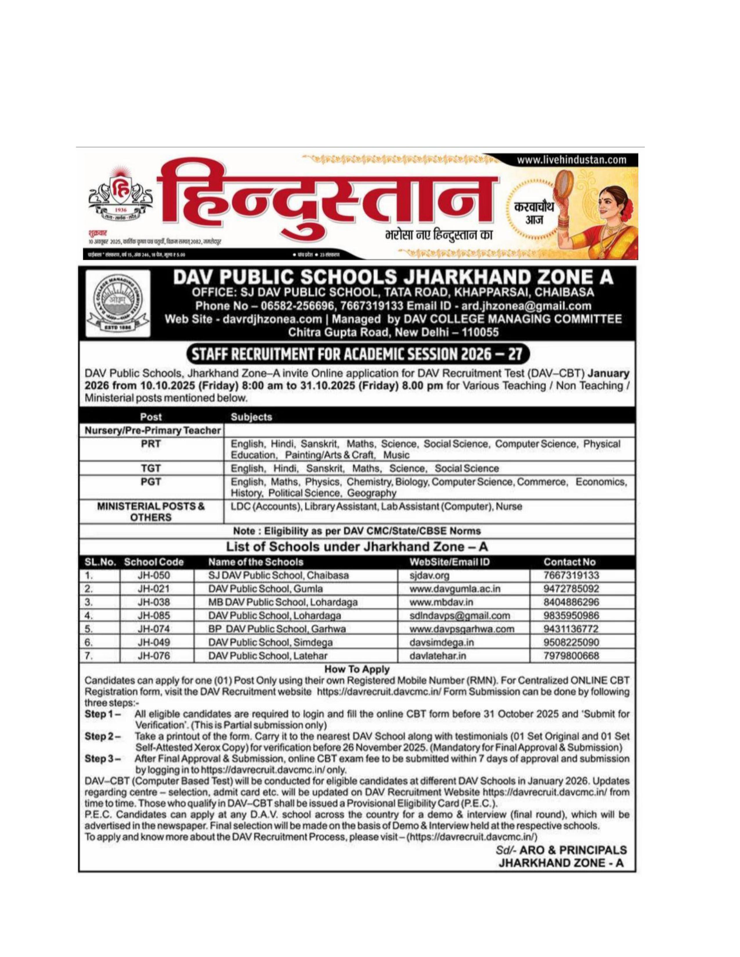 DAV Public Schools Jharkhand Zone - A invite online applications from eligible competent , and dedicated candidates for various teaching and non - teaching positions. For detail click on download section.